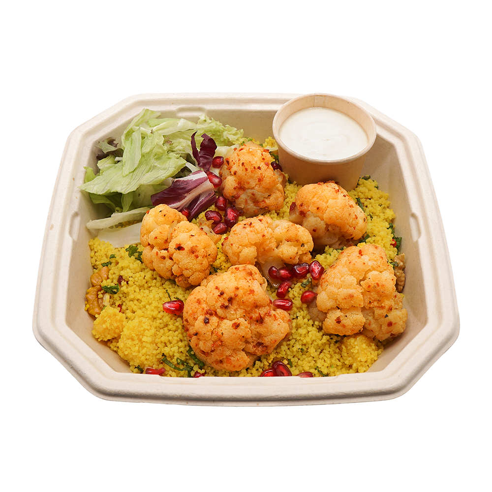 auf Couscous, verfeinert mit Granatapfel, Chili, Orange, Walnuss & Zimt, dazu ein Joghurt-Dip
