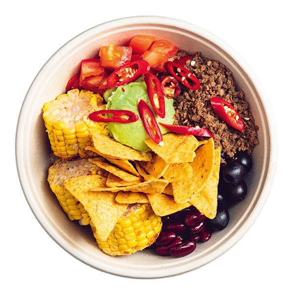 mit Wildreismischung, gegrillten Maiskolben, Kidneybohnen, schwarze Oliven, Tomate, veganes Hack, Guacamole, Tortilla-Chips und Chili.