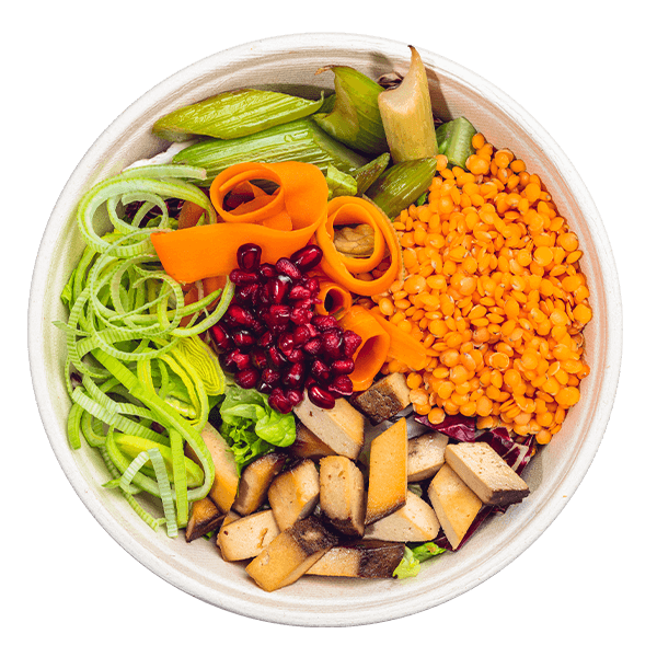 mit Salat-Mix, roten Linsen, Staudensellerie, Karotten, Lauch, geräuchertem Tofu und Granatapfelkernen.